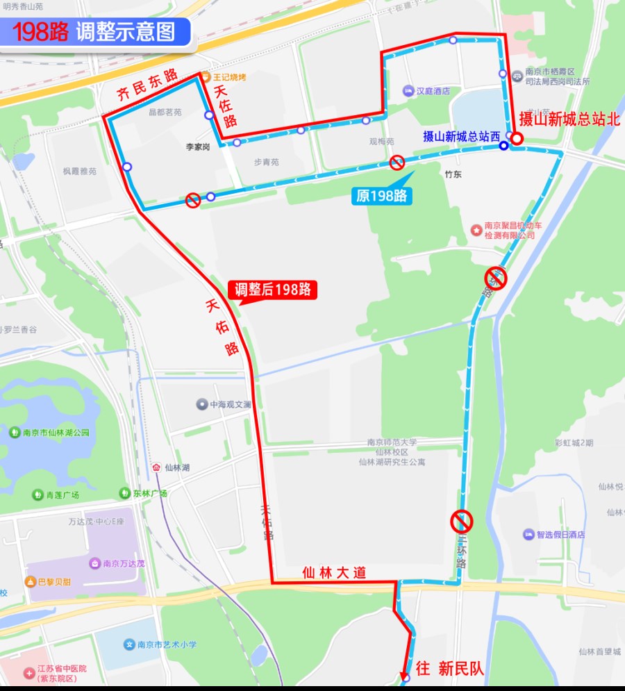* 走向調(diào)整:線路北段自“攝山新城總站北” 始發(fā),擬沿尤山路、朝陽路、攝山路、竹絲中路、竹絲西路、天佐路、齊民東路、天佑路、仙林大道、龍其線、捷運(yùn)大道龍王山大道至同興路回正線行駛(返程路段相同)。