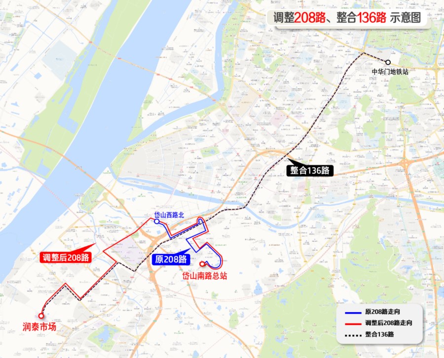 整合后線路北段由62路、96路、153路替代;南段由調(diào)整后的208路覆蓋。